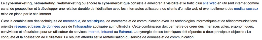 Si vous êtes positionnés sur de mauvais mots-clés dans les moteurs de recherche, vous allez recevoir des visiteurs, mais pas ceux que vous ciblez. N’hésitez pas à revoir vos mots-clés. Une des solutions pour trouver de l’inspiration est d’ouvrir une page Wikipedia. Par exemple, si je recherche sur Wikipedia le mot « Cybermarketing« , je vais retrouver dans le texte des mots-clés en gras, et surtout des liens hypertextes vers des sujets connexes. En parcourant ces différentes pages, vous devriez pouvoir trouver de quoi recentrer le référencement naturel de votre site. L’autre solution est évidemment de s’aider de AdWords.